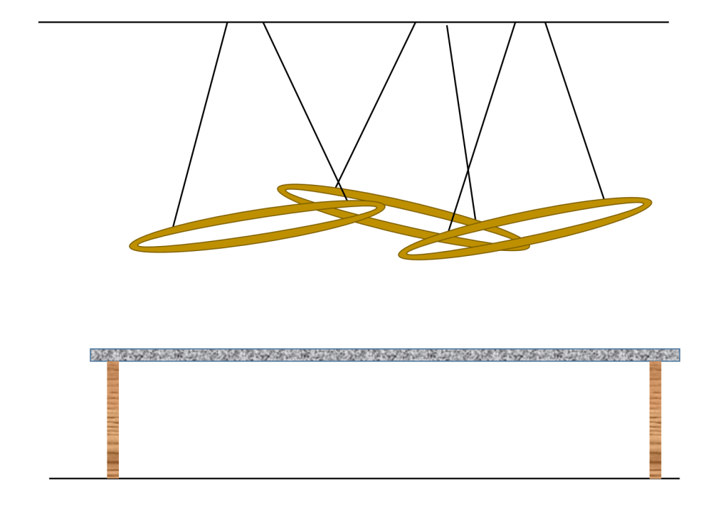 Rings are all aircraft cable suspended. Adjusting one cable can deliver a quirky angle for the ring. Repeat that with all of the suspended rings and the result will be a fun look. Don’t like it? The adjustment back to plumb, is easier than any of the other suggestions!