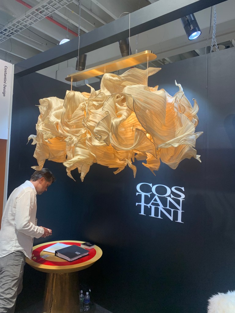Yet another interesting diffuser material was found at Costantini. Starched, stiff fiber was formed into a “cotton-candy-esque” cloud around the light source. We have seen plenty of organza used in lighting over the past decade, why not other fabrics?