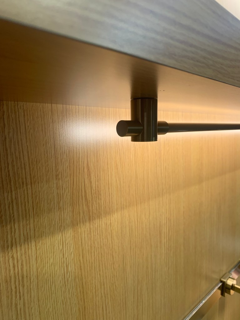 I really liked the Juniper alternative to under-cabinet lighting. Rather than the utilitarian box, this is a rail, offset from the underside of the cabinet by a barrel on each end. The rail rotates to deliver light as directed. This is a great solution for finished-bottom cabinets and shelves with a very purposeful look and design.