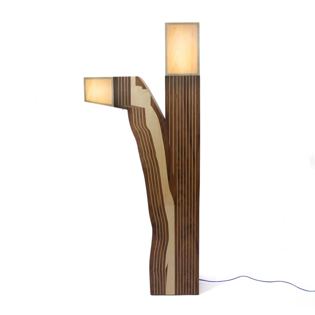 Wood has been a part of lighting, probably since day-one. Used as a diffuser? Probably less so. N J Roseti used thin slices of wood as a diffuser on quirky, “Memphis-esque” floor lamps. The wood delivered a warm glow and a totally different look. So nice to see this material use departure.