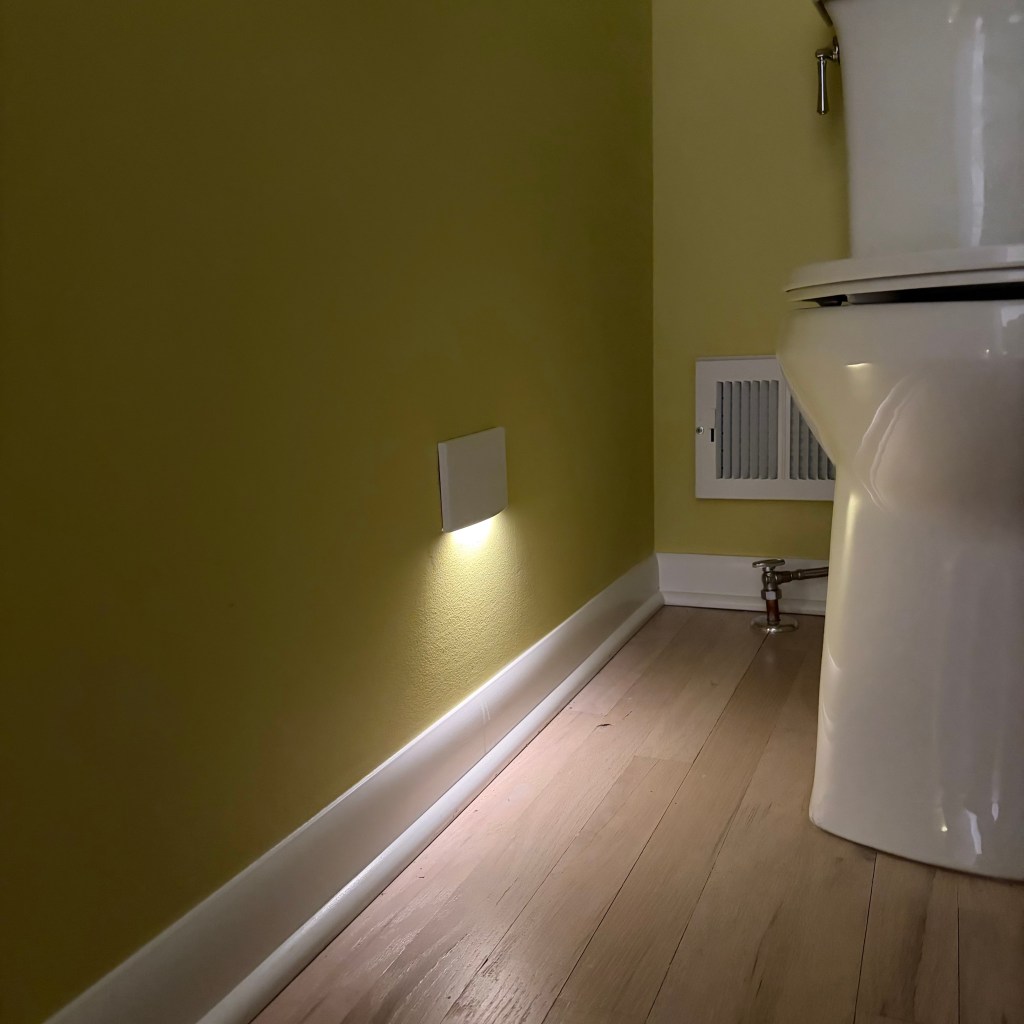 Like almost everyone, bathrooms are fully illuminated for less than an hour each day. Shower, personal grooming and you’re out of the room. From that point, there are only periodic visits. One of the most common accidents for seniors is falling and it is most chronic during nighttime visits to the bathroom. We all think we know the way, but nonetheless, falls occur. A curled-up cat, a stray ball of that day’s socks tossed on the floor and balance is lost. Having low-level light and a clear path from bed to the bathroom is essential as we age. In our scenario, the under-vanity and step lights are the hardest working fixtures in the bathroom. They consume a miniscule 12.38 watts of electricity, but can be lifesaving.