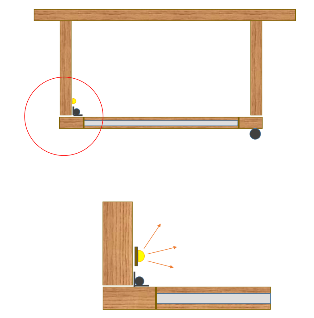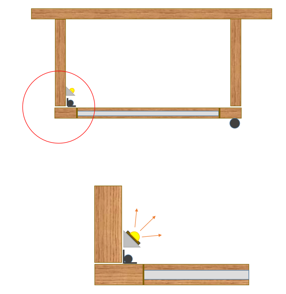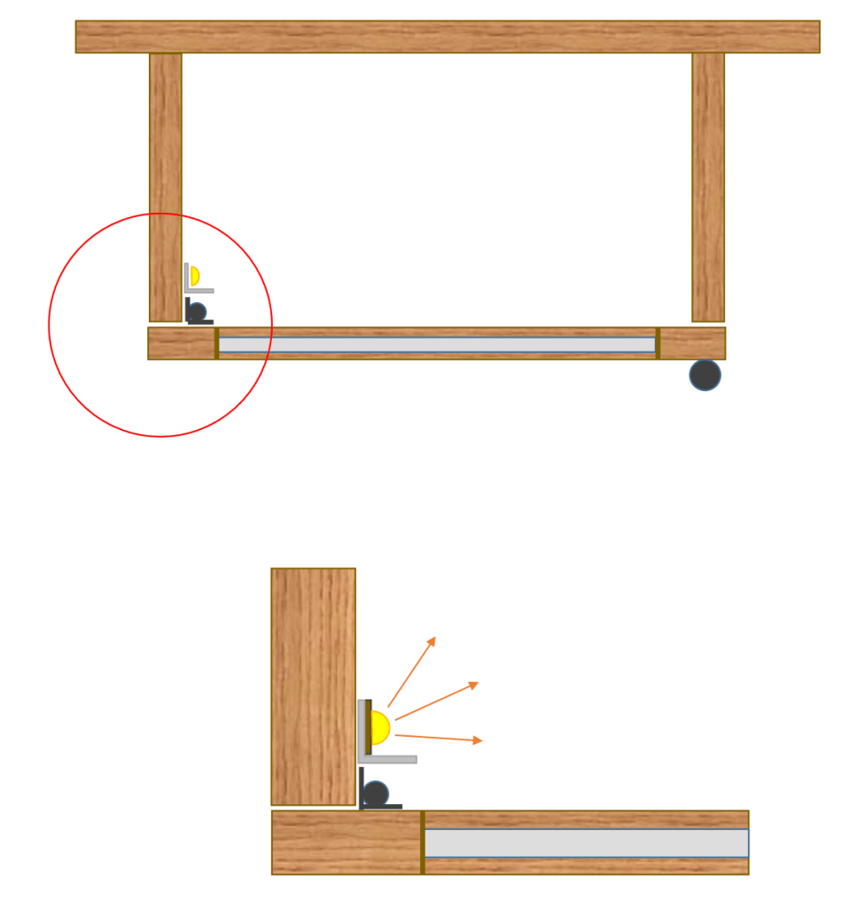 If the visibility is objectionable, all LED Tape manufacturers sell aluminum or plastic channels. Two options work, a ½” x ½” 45° channel or a ½” x ½” “L” channel. The 45° channel would be installed in the hinge corner. The LED Tape would then be connected to the 45° angle, aimed into the cabinet at an angle. If you elect to use the “L” channel, install the channel against the side with one legs of the “L” facing the front. The LED Tape is installed on the other leg. The forward leg of the “L” will block the view of the light from the user.
