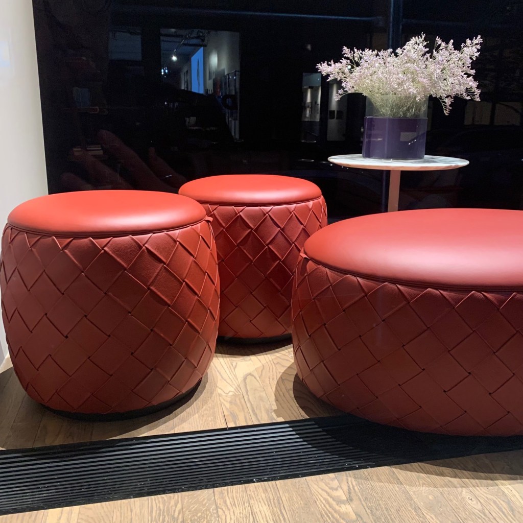 Liro from Brazil displayed split-back leather chairs. To differentiate, the “split” was filled with a tweed fabric or a rattan fiber. Adding this alternate material to the cool leather softened the look and elevated the interest.