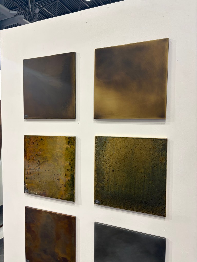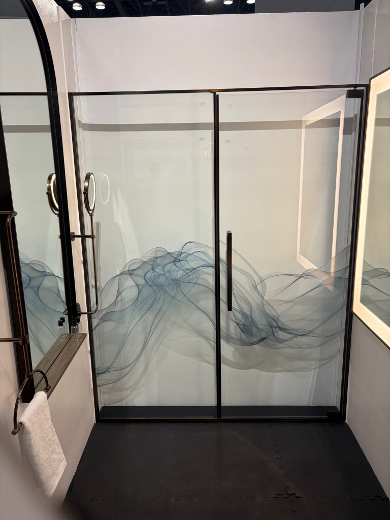 There was lots to appreciate at the Mirror Image booth. The custom shower enclosures were nice, especially the graphics on the glass. In a hospitality situation, I could imagine a different image on every door in each room. It could be a fun conversation point that probably won’t translate to a residence, however. The simple hardware also fit the doors. In addition, they offered a collection of patina metal panels to be used as decorative wall coverings. I found these interesting. Not rated for inside a shower enclosure, it was simple a different option for walls.