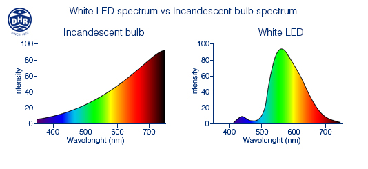 All white LED starts with a blue diode that is influenced by phosphors. That blue seed is visible in the LED spectrum as the blue hump on the left, before the huge rise into light blue, green and yellow. The almost nonexistent “red” at the right is the reason humans feel that LED is somewhat cold, or less comforting than the “warm” old incandescent.