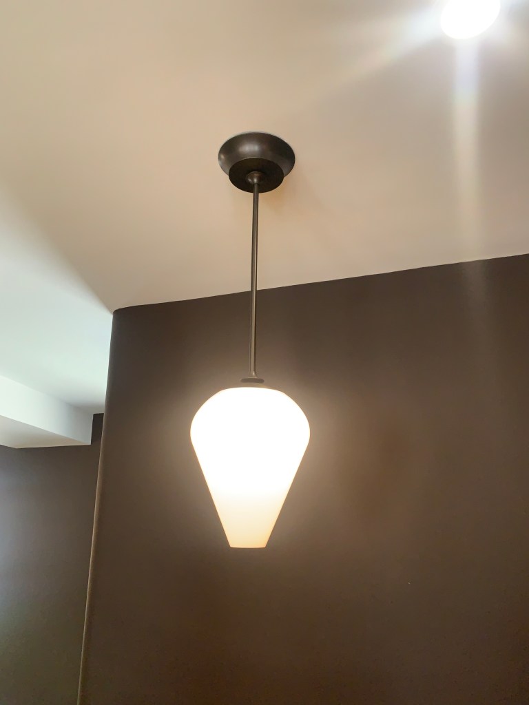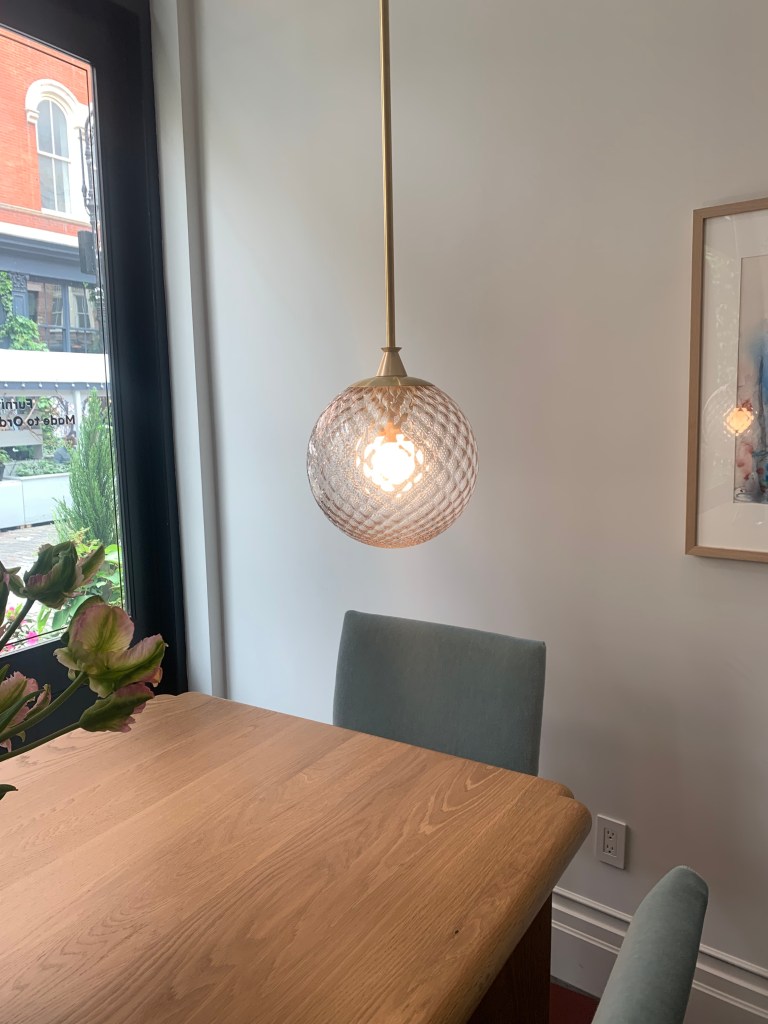 Also in SOHO the Roll & Hill showroom featured The Met Pendant, likewise using a warm beige glass. The difference a quarter-century makes is the shallowness of the diffuser, made possible by LED. At that time, we needed to enclose incandescent and even the much larger fluorescent lamping. That meant bowls were quite large. This slender profile defines the difference when trends reemerge and are not exactly the same.