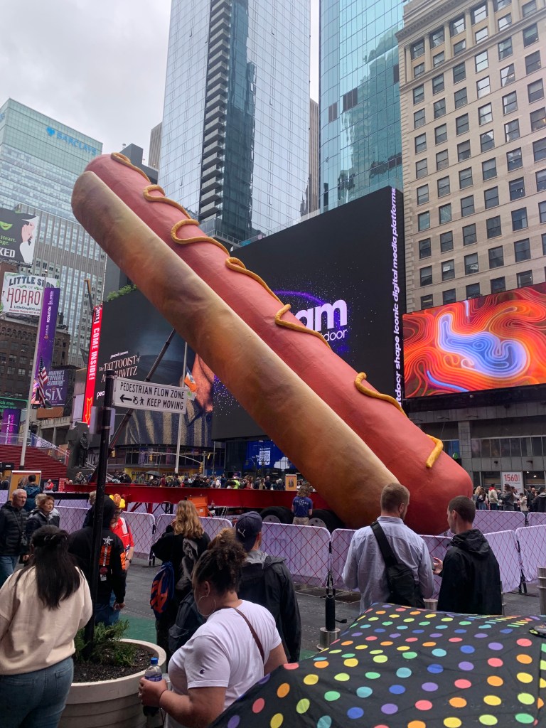 The “infamous” NY Times Square Hot Dog art installation, moments prior to its noon daily explosion